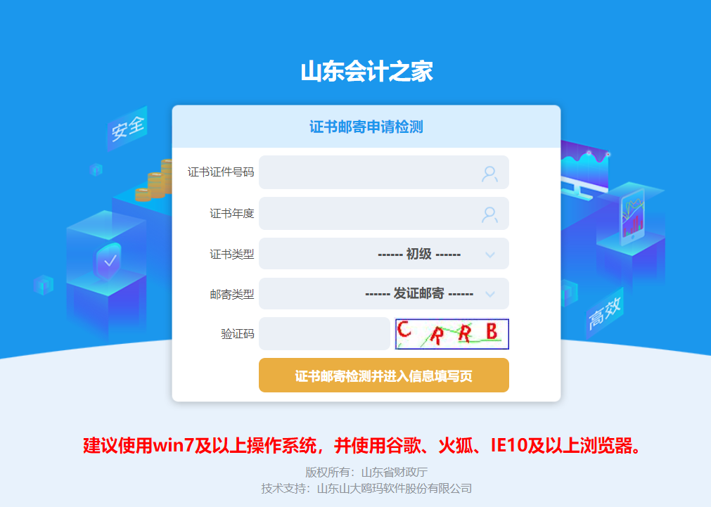 (二)邮寄领取。登陆山东会计信息网“山东会计之家—证书邮寄申请”申请邮寄服务,所需费用为邮政EMS到付。申请人员填写身份证号码等信息后,点击“证书邮寄检测并进入信息填写页”,即可查询证书所在县区(开发区、农高区)。申请人须准确完整填写邮寄地址、联系方式等信息,因信息有误或不详细导致证书无法送达的,由申请人承担相应责任。